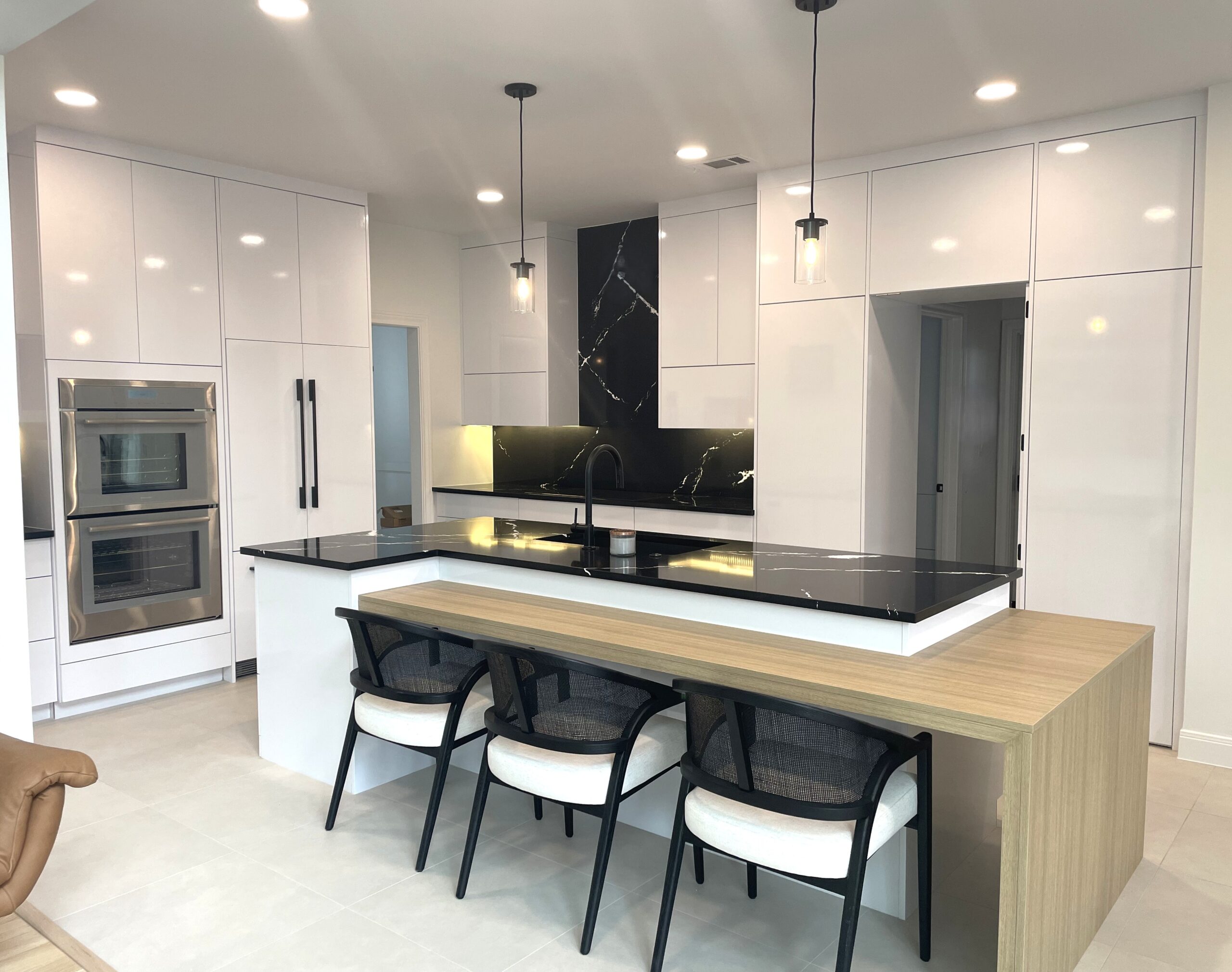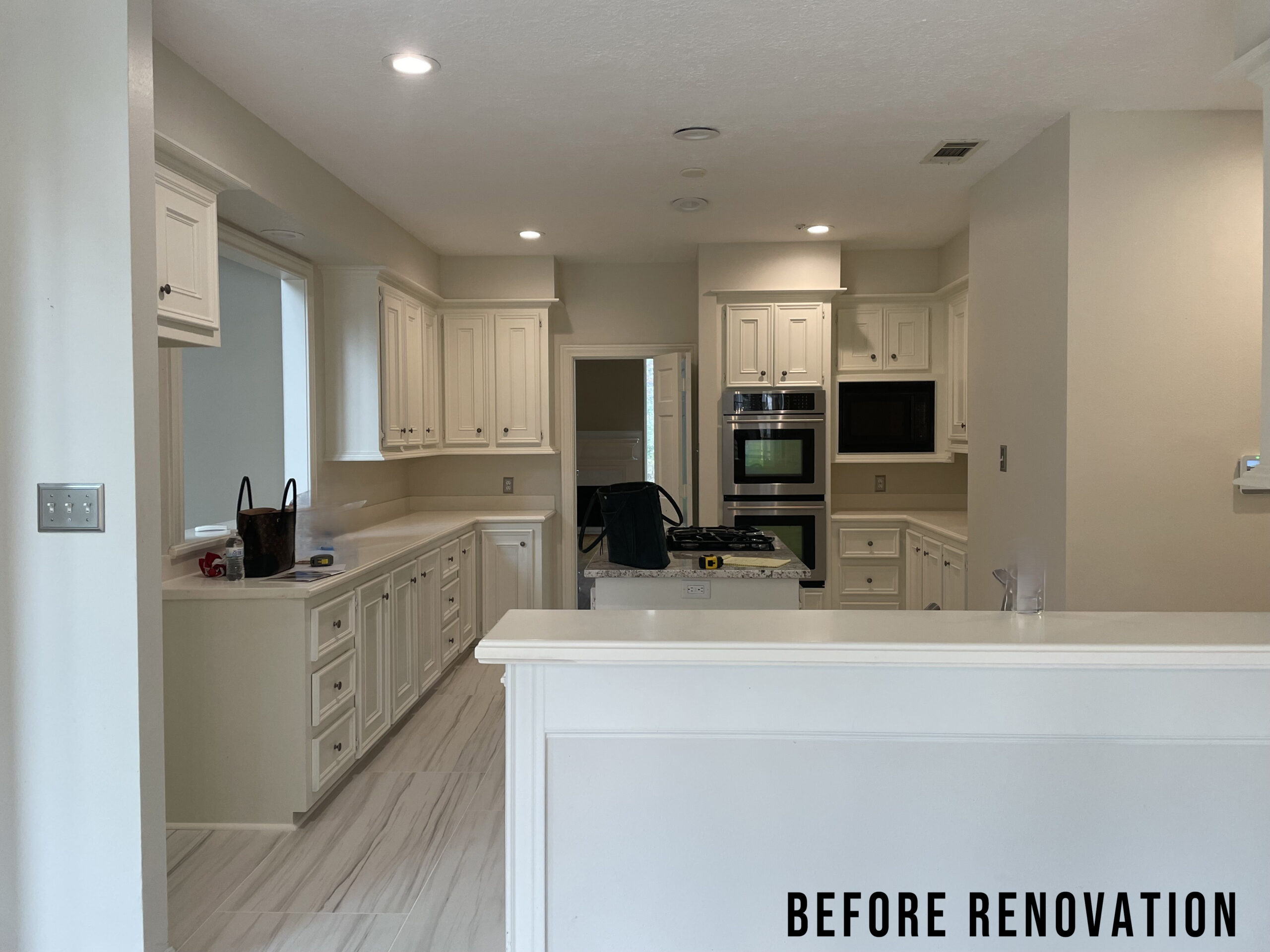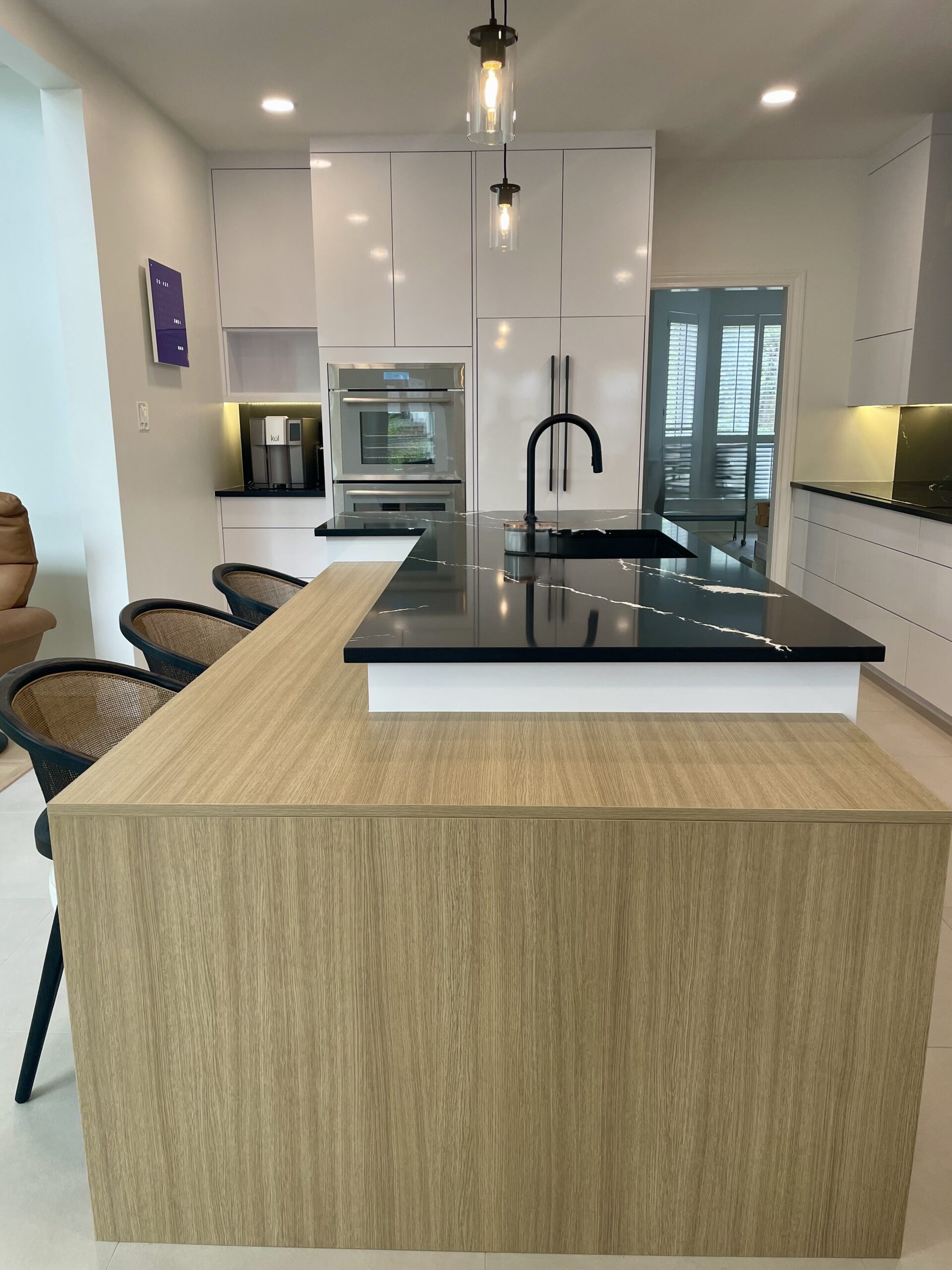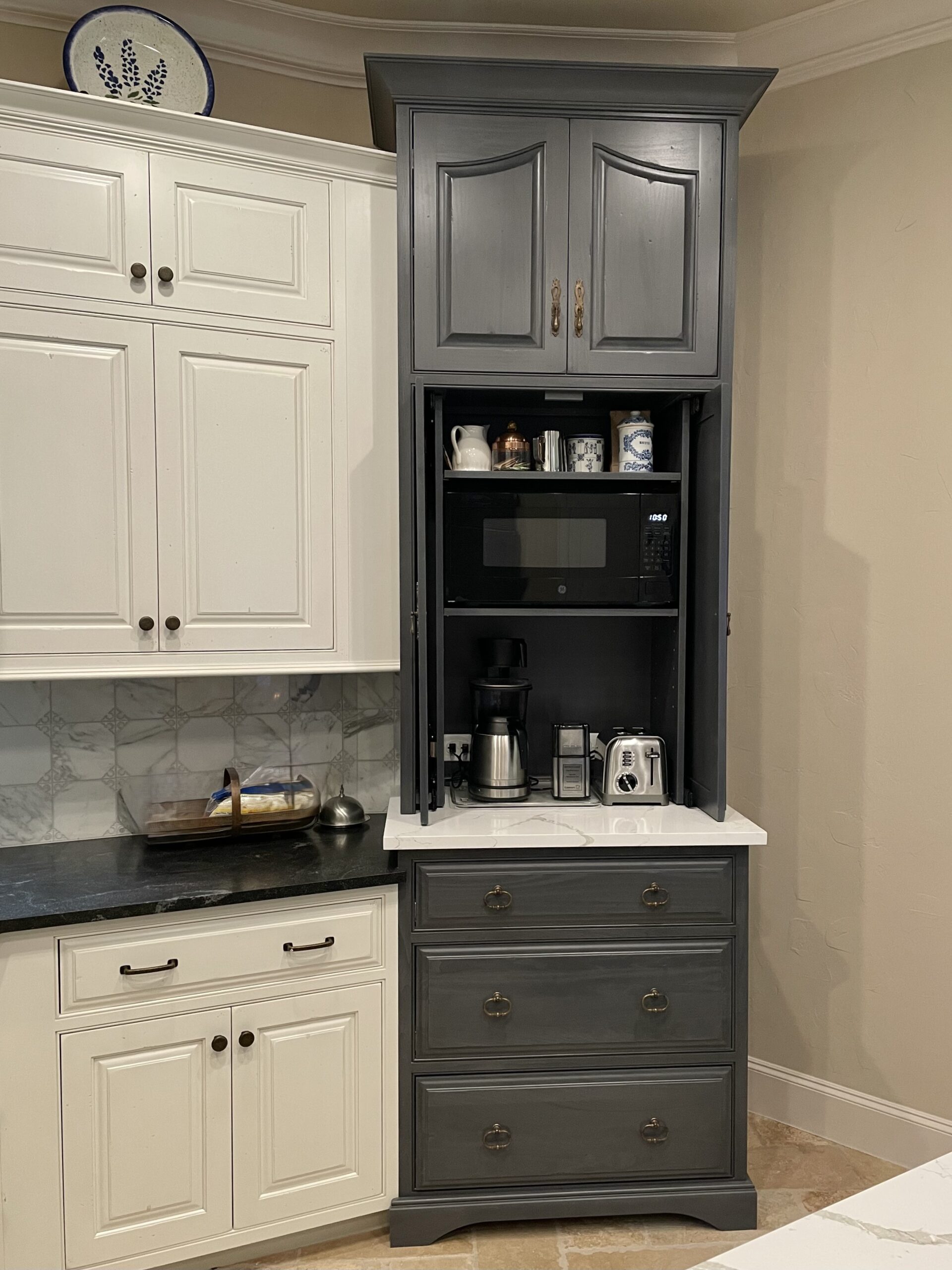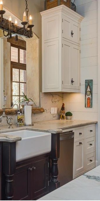 This elegant kitchen renovation transforms the room from a confined area into an open and airy space that facilitates easy movement and conversation. The large island is equipped with a farmhouse sink and features turned corner posts, which add a rustic yet sophisticated charm. The coffee niche has an unfitted design, contributing to the character of the space.