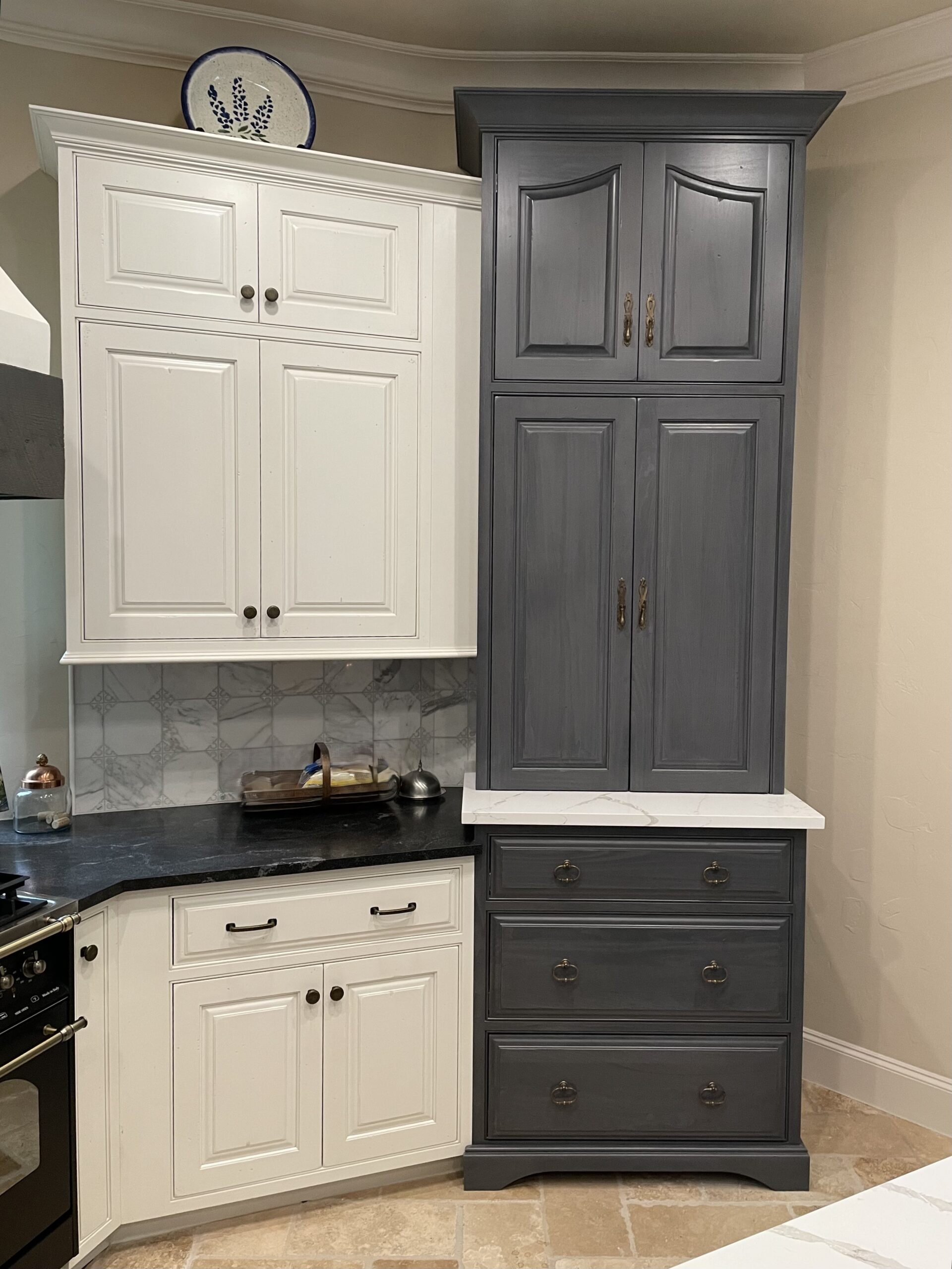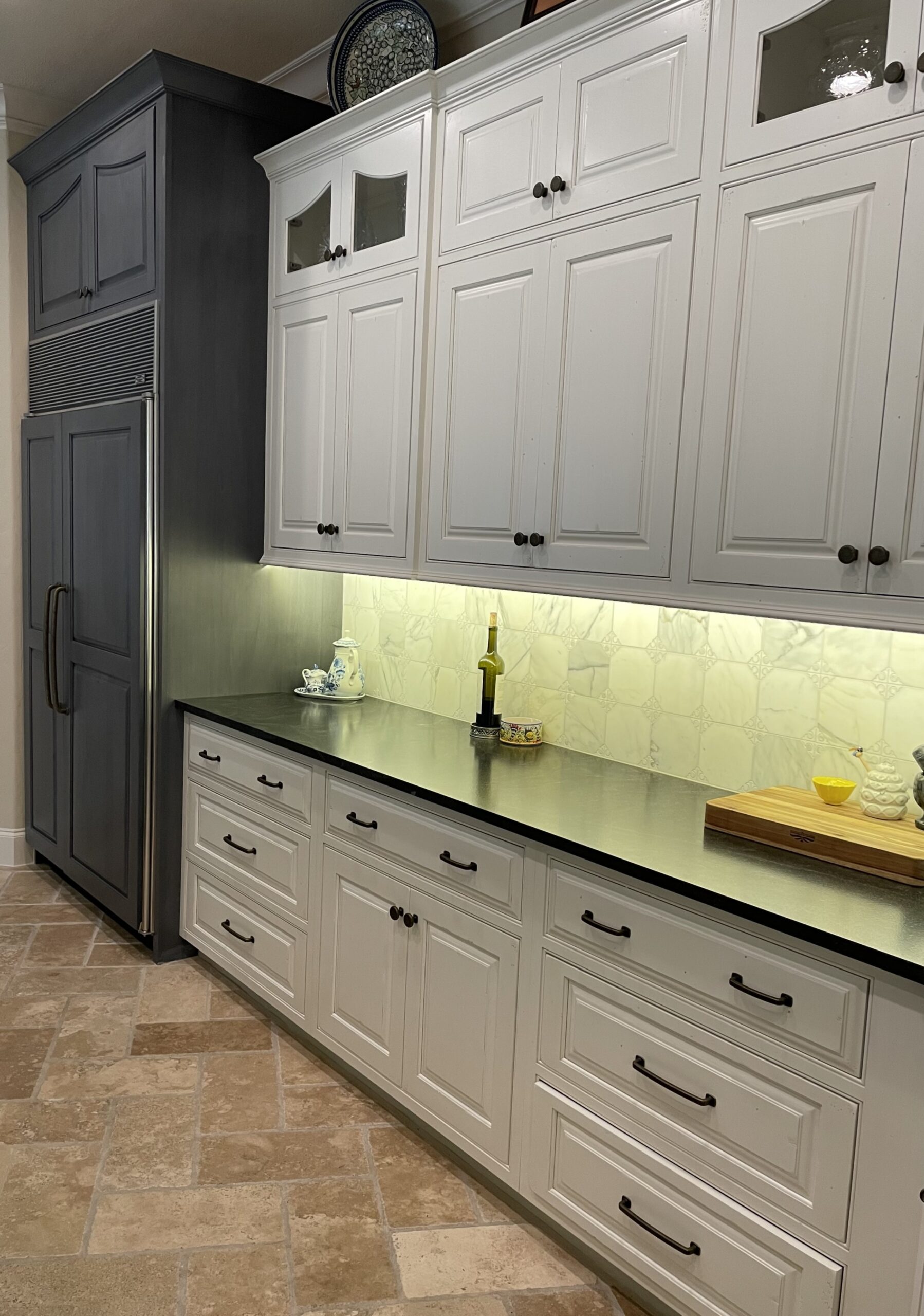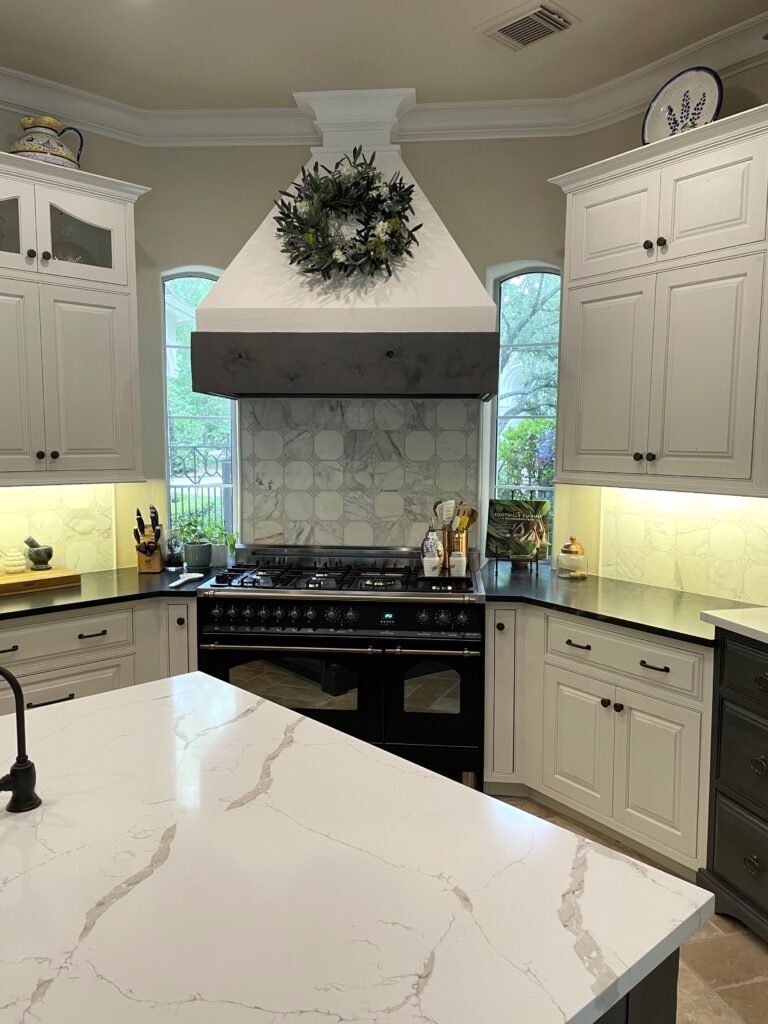 The travertine flooring enhances the historical aesthetic and harmonizes with the blue-gray stain. The perimeter countertops are crafted from honed black granite, providing an appearance akin to soapstone countertops.