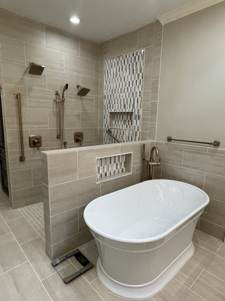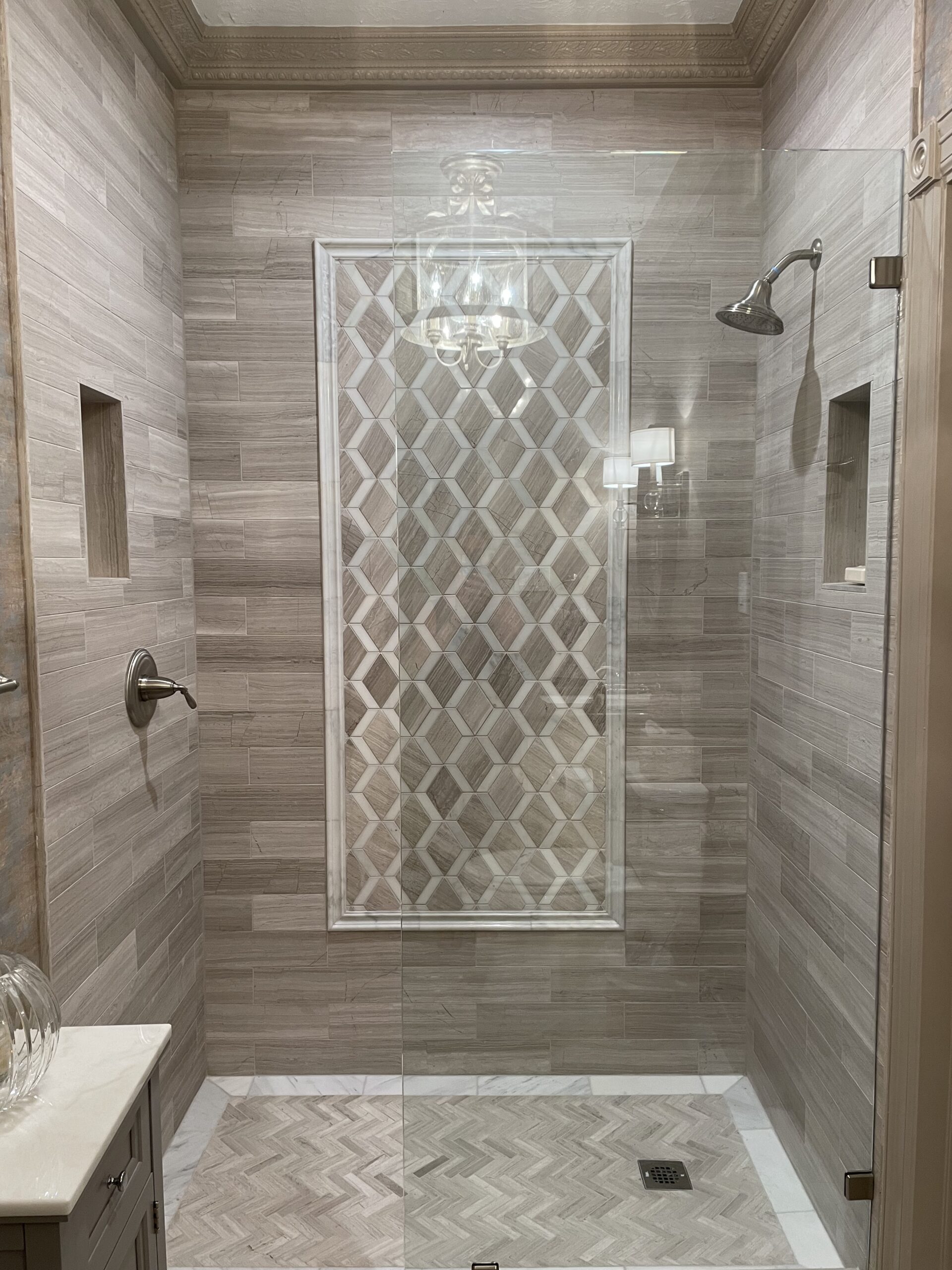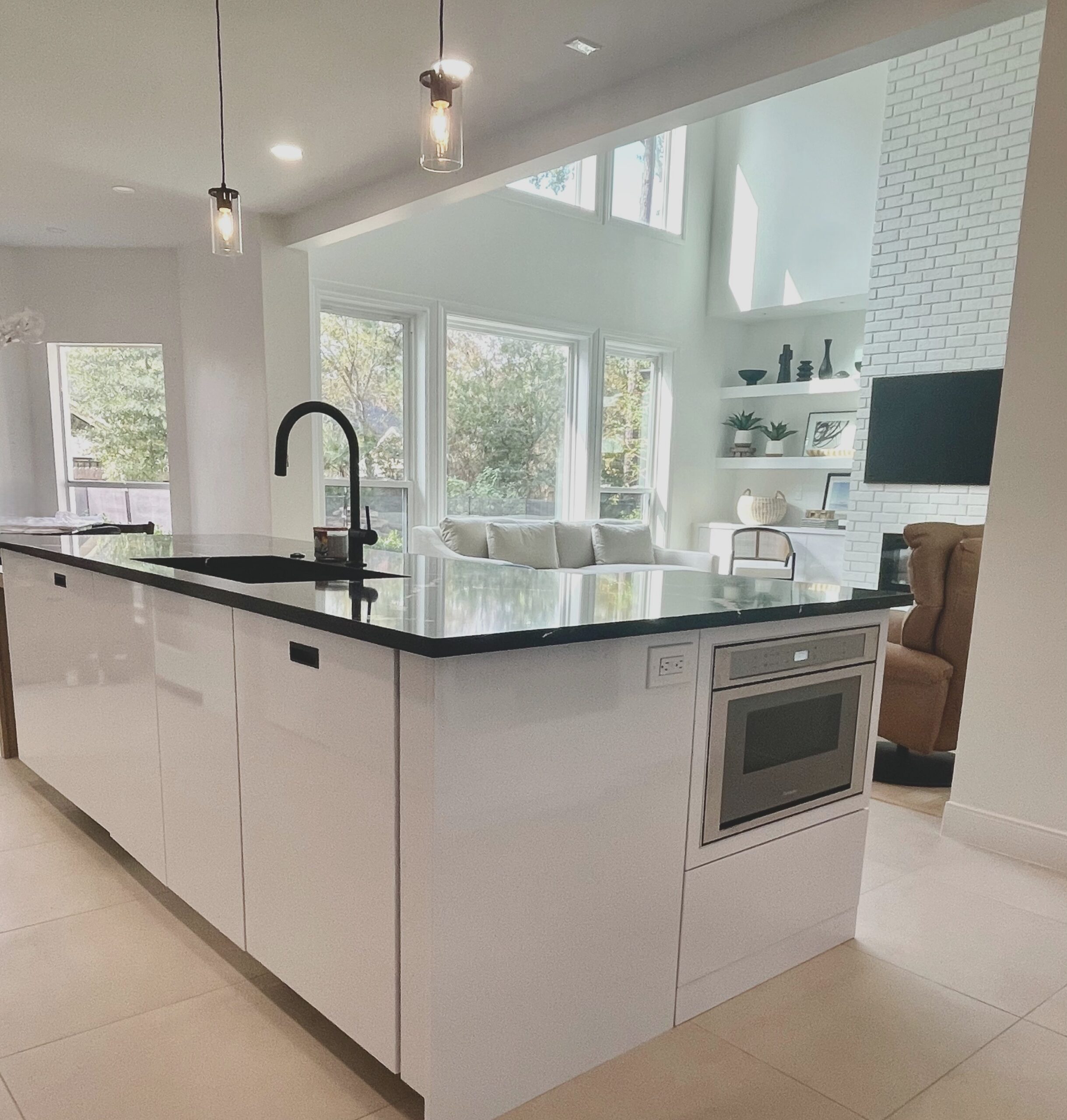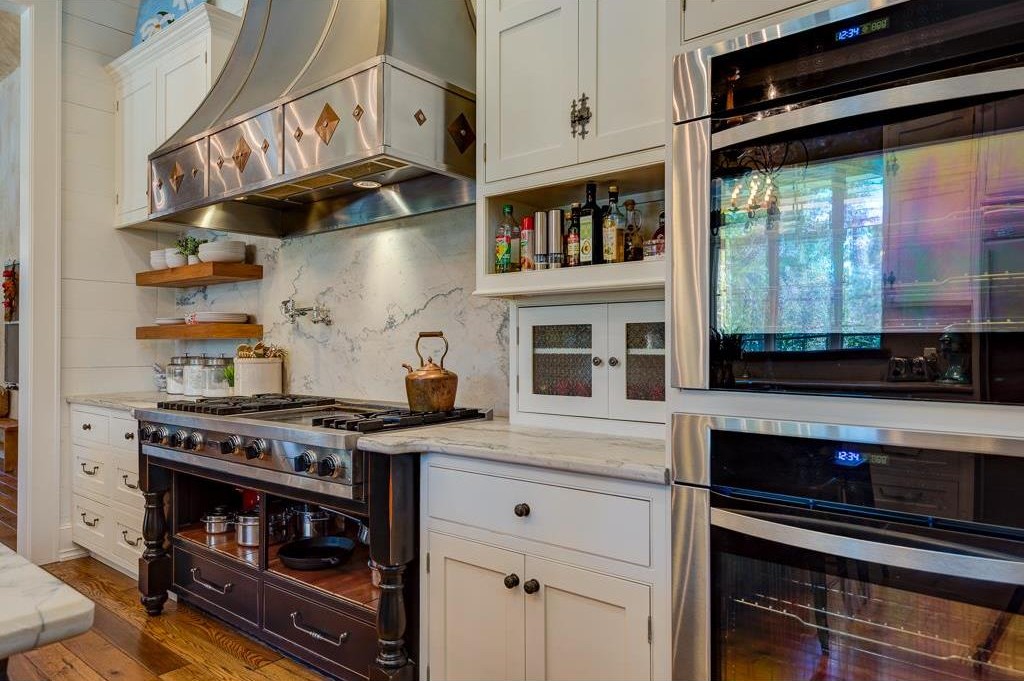 The travertine flooring enhances the historical aesthetic and harmonizes with the blue-gray stain. The perimeter countertops are crafted from honed black granite, providing an appearance akin to soapstone countertops.